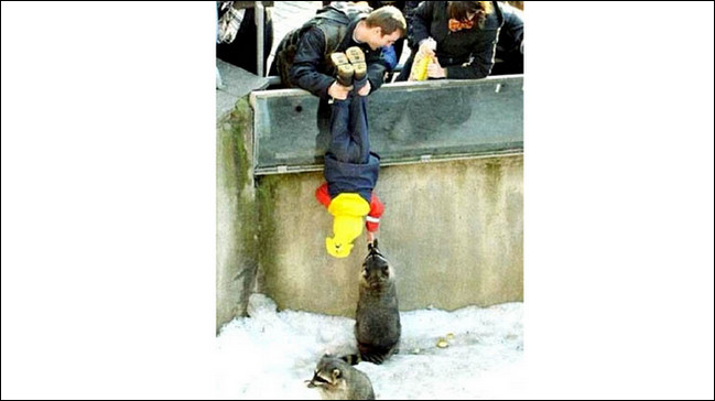 4. Memberi MakanAda-ada saja orangtua yang satu ini. Agar anaknya bisa memberi makan hewan rakun di kebun binatang, ia tak segan-segan menurunkan putranya ke bawah.