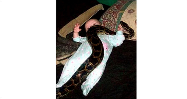 3. Ular PitonBagi yang memelihara reptil, jangan tiru kelakuan orangtua seperti ini. Walaupun sudah kenyang, ular piton tidak boleh dibiarkan berada di dekat bayi.