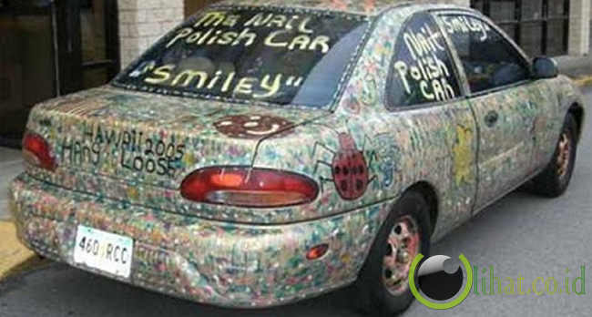 [lihat.co.id] - Yvonne Millner dari South Carolina, memutuskan untuk membuat mobil Mitsubishi Mirage miliknya menjadi tampilan yang berbeda, jadi dia memutuskan untuk mengecat mobilnya dengan cat kuku. Dia memulainya dengan menggambar wajah tersenyum, tapi sekarang dia telah mendesain pola dan slogan yang dicat ke seluruh badan kendaraan. Dia kadang-kadang menghabiskan 3 sampai 4 jam sehari untuk itu, dan telah menggunakan ratusan botol cat kuku dengan warna yang berbeda, sehingga membuat penampilan mobil ini menjadi unik dan berwarna-warni.