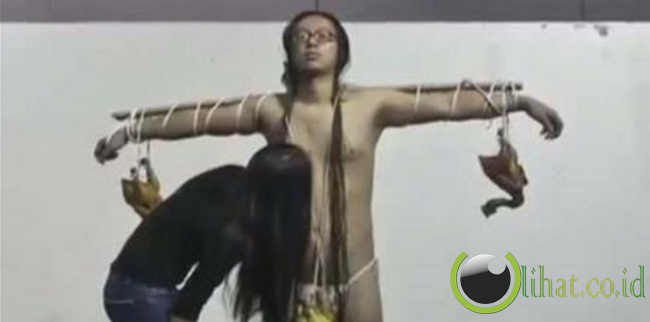 Surat kabar the Daily Mail melaporkan, Sabtu (12/1), Yi melakukan aksinya di sebuah auditorium kota itu. Dia hanya menutup organ intimnya dengan kain, berdiri dan mengangkat tangannya terikat di kayu. seorang perempuan terlihat menjilati dan menggigit tubuhnya.