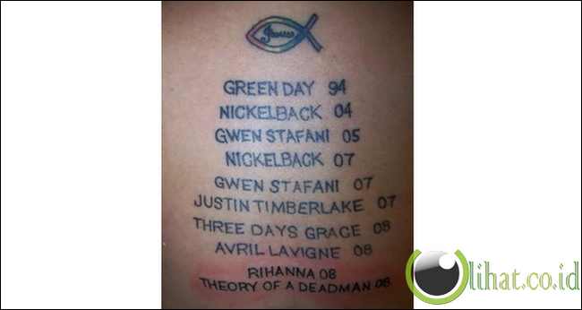 [lihat.co.id] - Ya, kadang menjadi sebuah kebanggaan bagi seseorang bila bisa datang ke konser musisi idolanya. Pria ini pun mengekspresikannya melalui tato di tubuhnya. Ia selalu membubuhkan tato setiap kali menghadiri konser. Namun ia tampaknya harus menanggung malu setelah salah menulis nama Gwen Stefani menjadi Gwen Stafani. Parahnya, ia dua kali melakukan kesalahan tersebut.