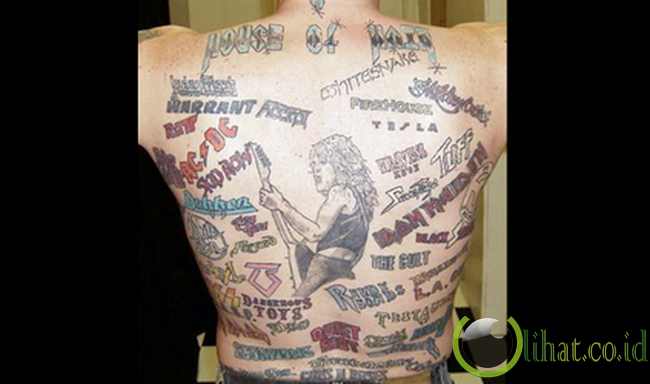 [lihat.co.id] - Pria ini tampaknya benar-benar mencintai aliran musik rock secara keseluruhan. Bagaimana tidak, sejumlah nama band rock seperti ACDC, Warrant, Tesla, Whitesnake, The Cult, Iron Maiden dan masih banyak yang lainnya telah diabadikan melalui tato di tubuhnya. Namun sayang, bila dilihat sekilas, tubuh pria ini lebih mirip dengan lemari yang full dengan sticker.