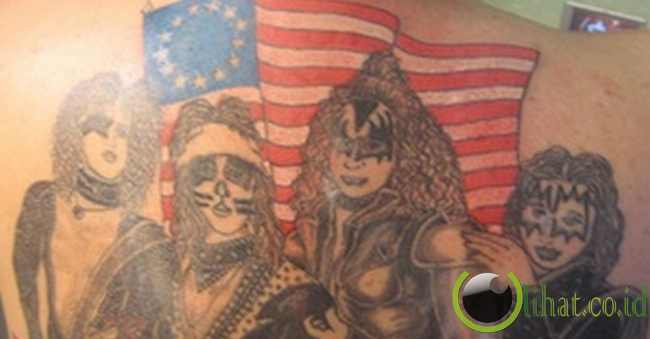 [lihat.co.id] - Bermaksud menggambarkan rasa cintanya terhadap Kiss dan negaranya, Amerika Serikat. Seorang fans Kiss membubuhkan sebuah tato Kiss dengan formasi lengkap dengan background bendera Amerika Serikat berbintang 13. Namun jika dilihat dengan seksama, para personel Kiss lebih mirip dengan tokoh-tokoh kartun di buku komik. Ya kan?