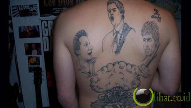 [lihat.co.id] - Terisnpirasi dengan cover album DOOKIE, milik Green Day, seorang pemuda rela membuat tato bergambar 3 personel Green Day lengkap dengan 'ledakan' khas cover album DOOKIE berukuran besar di punggungnya. Namun sayangnya wajah-wajah personel Green Day akan susah dikenali di tato ini. Bahkan wajah sang bassis lebih mirip Tyler Durden dari FIGHT CLUB daripada Mike Dirnt sendiri.