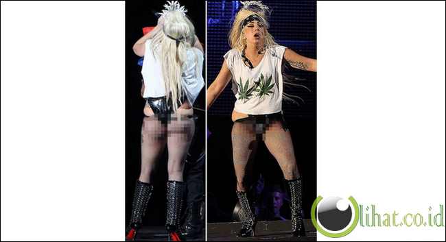 Kaos tanpa lengan putih bergambar daun ganja ia padukan dengan stocking hitam motif lubang-lubang. Otomatis kaki dan pantat Gaga terekspos dengan jelas.