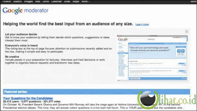 8. Google ModeratorGoogle Moderator adalah semacam forum online terbuka yang bisa diikuti siapa saja untuk mendiskusikan beragam topik, bertanya dan berbagi ide.