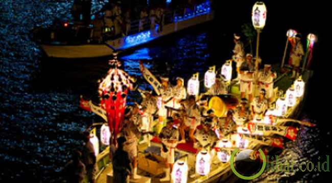 6. Tenjin Matsuri (24-25 Juli) di Osaka [lihat.co.id] - Merupakan salah satu festival besar dan terkenal di Jepang, dimulai sekitar tahun 1000. Ribuan orang berarakan menggotong kuil-kuil kecil o-mikoshi dari kuil Temmangu ke Jembatan Tenjin, kemudian naik perahu-perahu hias dan selanjutnya dilakukan pesta kembang api.